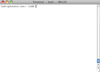 • Ahora modificamos el archivos hosts para que el ordenador cuando conecte a la web en Drupal en vez de navegar por la red nos presente la web que estamos creando  en nuestra máquina.  Ejecutamos el Terminal de Mac (Aplicaciones/utilidades/Terminal) y tendremos la siguiente ventana:
