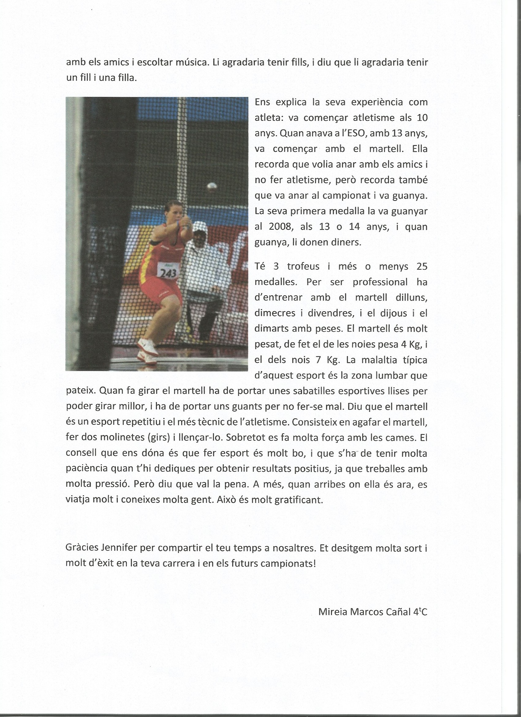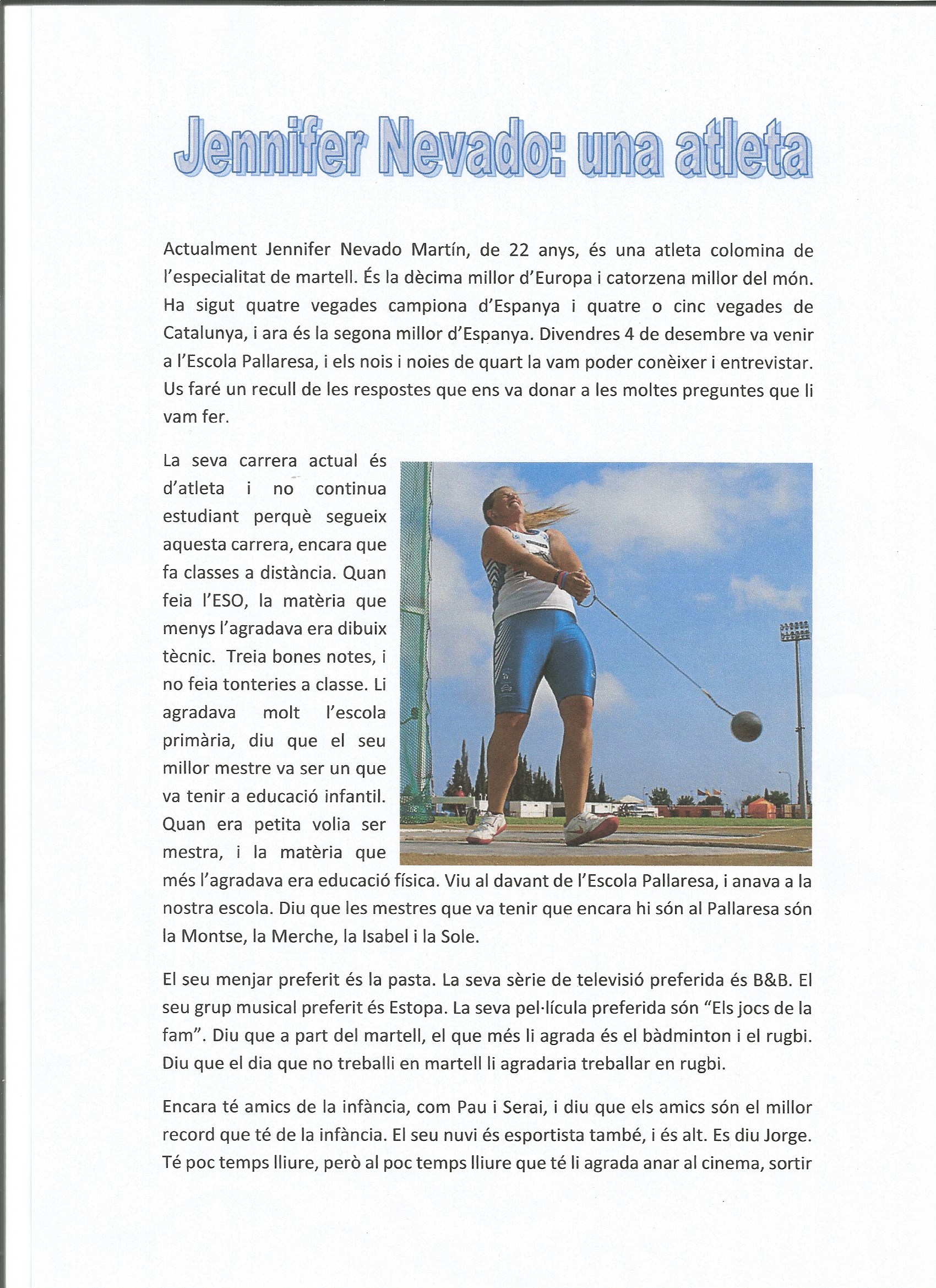 El passat divendres 4 de desembre, els quarts vam tenir la sort d’entrevistar a la Jennifer Nevado. Una exalumna de la nostra escola especialitzada en el llançament de martell.