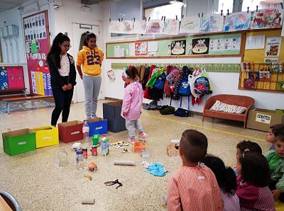 Els alumnes de sisè han vingut a fer-nos una activitat de reciclatge relacionada amb el projecte que estan fent. Ens han explicat quin material es recicla a cada contenidor i hem fet un joc per a classificar diferents objectes que han portat (ampolles, llaunes, teles, paper…)