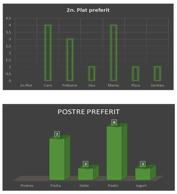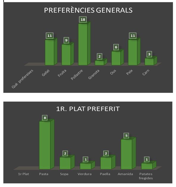 Hem arribat a la conclusió que a la gent li costa pensar quin menjar li agrada. Acostuma a dir que: “LI AGRADA DE TOT” però realment no mengen de tot. Mengen més carn, pasta, amanides i pastissos. No gaire variat. I saludable al 60-70%