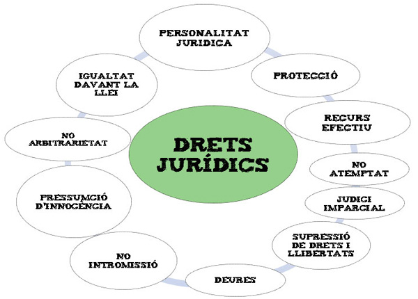 Els drets jurídics són els que exigeixen la protecció dels tribunals de justícia. Són el conjunt de normes jurídiques que regulen l’actuació davant la justícia pels qui reclamen el reconeixement dels seus drets davant els òrgans jurisdiccionals. Això vol dir que tothom té dret a un sistema de justícia competent que garanteixi el compliment de la llei. Té dret a: