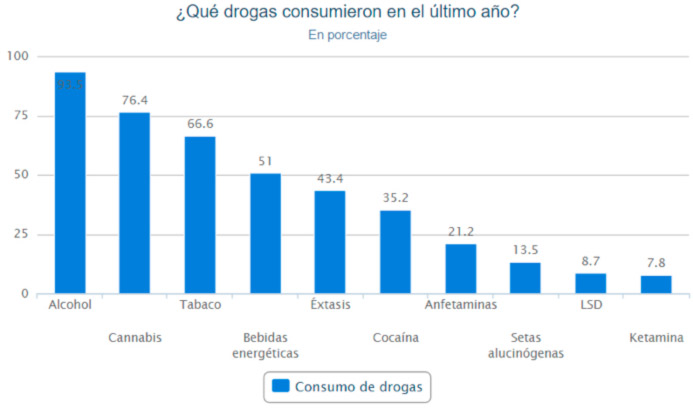 L’alcohol continua al capdavant com a substància que més persones consumeixen i que provoca més problemes. Més de la meitat del jovent enquestat (52%), reconeix haver begut de manera imprudent durant l’últim any. La cervesa és la beguda més consumida. Darrere de l’alcohol, apareix el cànnabis, el tabac i les begudes energètiques. Una part important dels enquestats, també va reconèixer haver consumit MDMA – metilendioximetanfetamina,- o èxtasi (amb un augment del consum, 43% dels enquestats), cocaïna i amfetamines.