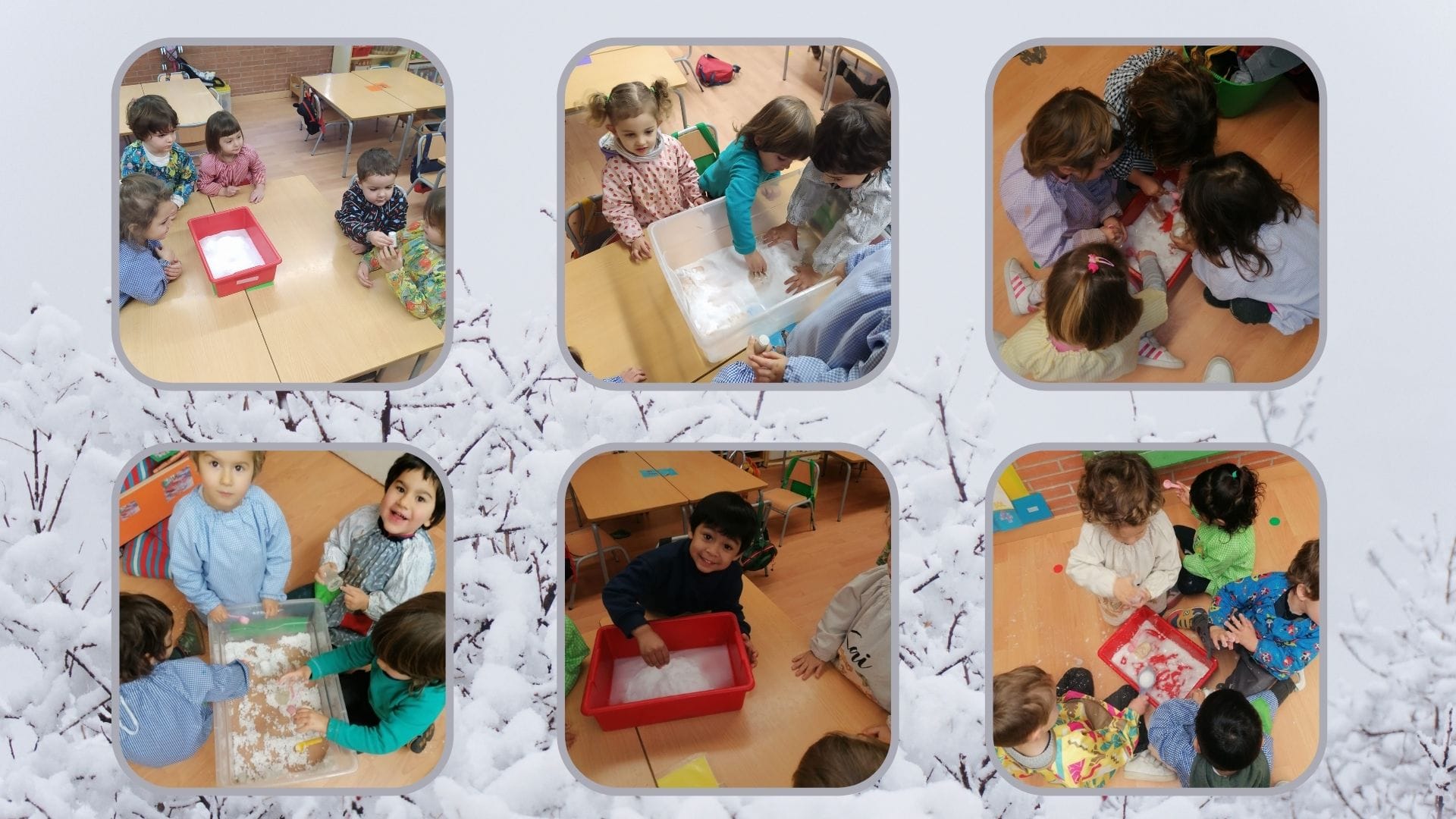 Com a Barcelona hi neva molt poquet hem decidit de fer la nostra neu. L’ hem fet amb aigua, bicarbonat i una mica de purpurina! UAUUU BI-CAR-BO-NAT, quina paraula més llarga i difícil! Però hem sigut capaços de dir-la molt bé! Hem barrejat els nostres ingredients, i hem comprovat que és igual que la neu real! És blanca, brillant i freda!