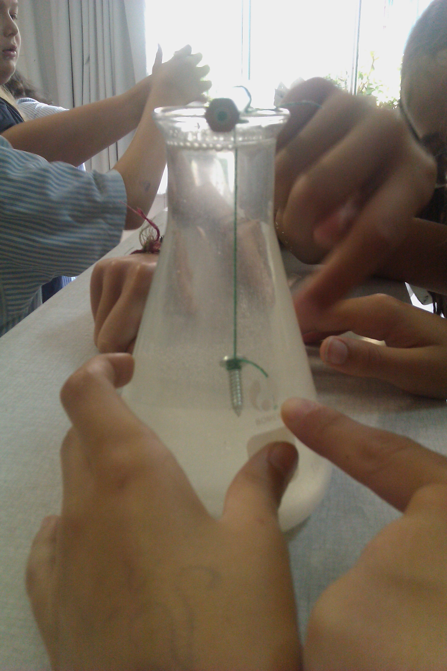 Quan ja s’ha acabat de filtrar la sal, agafar un llapis i lligar-li un fil cap al centre, de manera que estigui mig submergit en l’aigua. Després acostar el recipient amb la dissolució al cantó del sol perquè l’aigua es vagi evaporant, fins que al cap d’uns dies veurem què ha passat.