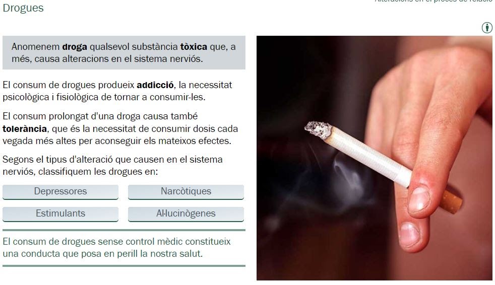 Cada membre buscarà informació sobre com a mínim dues drogues i els seus possibles efectes, com aquesta droga actua sobre el sistema nerviós i riscos per la salut.