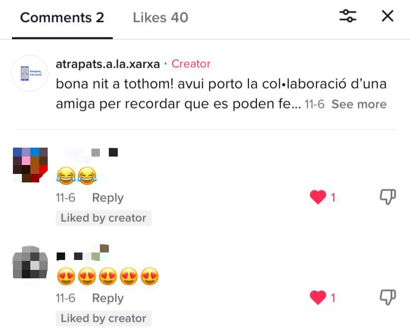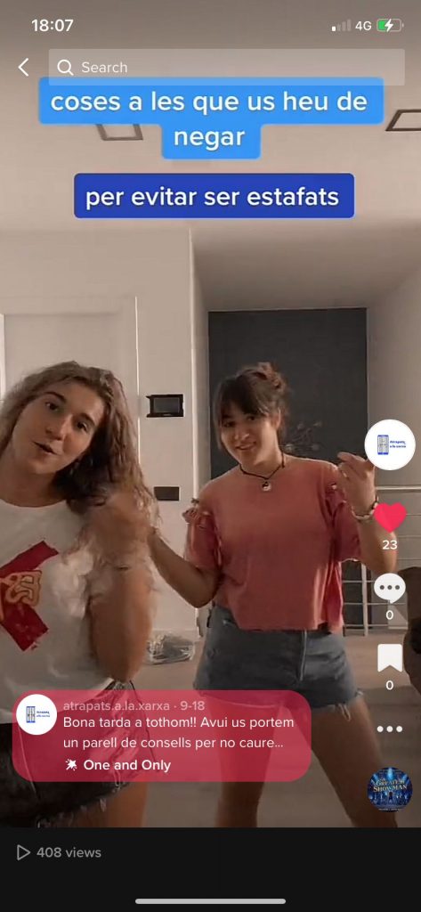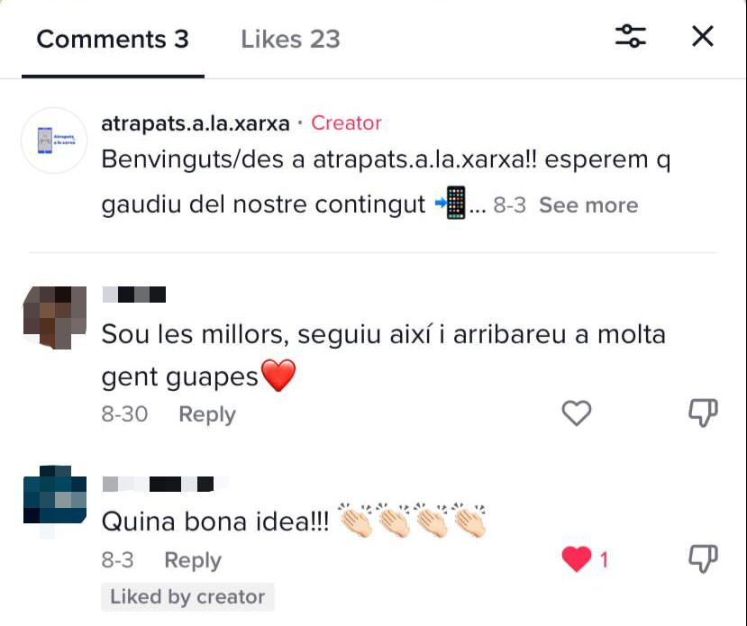 A TikTok també hem rebut molt de suport, no tant com a Instagram però sí que més que Twitter. En aquesta plataforma sobretot hem donat consells, no hem donat tanta informació com a Instagram ja que això requeriria escriure molt text i als vídeos de TikTok a la gent no li agrada llegir en aquesta mena de vídeos.