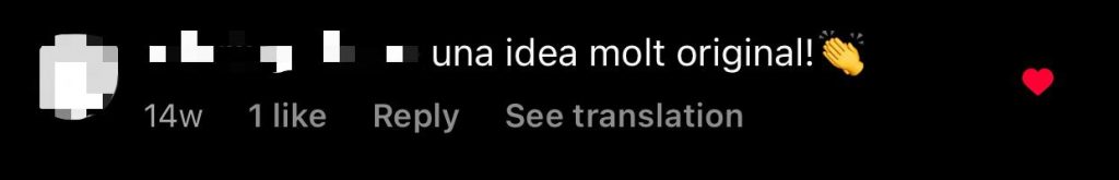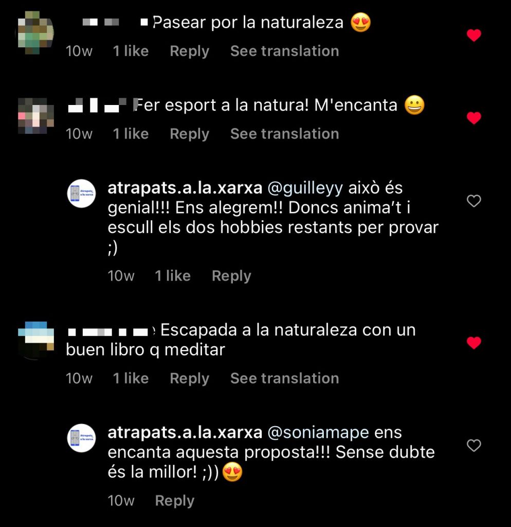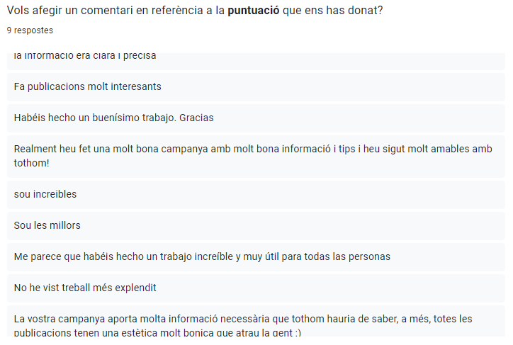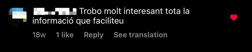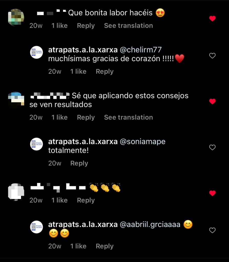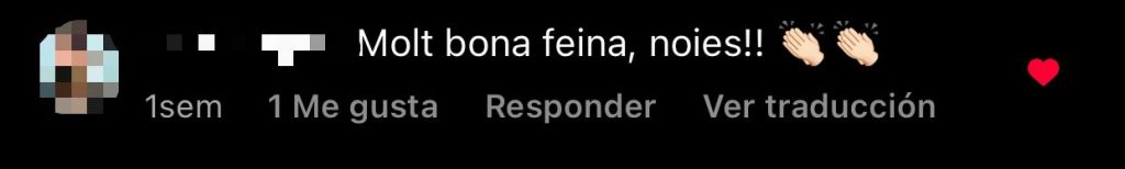 Instagram ha sigut la plataforma on hem rebut més missatges i comentaris per part dels i les nostres seguidors i seguidores. Han sigut molt amables i han interactuat moltes vegades amb nosaltres. Aquí hi ha alguns exemples de comentaris que ens han fet alguns dels i les nostres seguidors i seguidores: