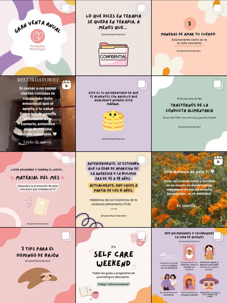 Ens vam inspirar en aquests dos, ja que @myhealthymindproject un és un compte que intenta conscienciar als seus seguidors sobre l’amor propi i la salut mental, i @creixerendigital parla sobre les xarxes socials i dona tips sobre publicacions a Instagram i més. Encara que no tenen molt a veure amb la nostra campanya, ens va semblar interessant la seva informació i ens vam inspirar en algunes publicacions per poder fer les nostres. A més també vam inspirar-nos en els dissenys que feien ja que eren visuals, esquemàtics i bastant bonics.