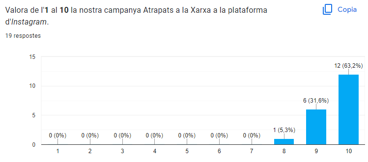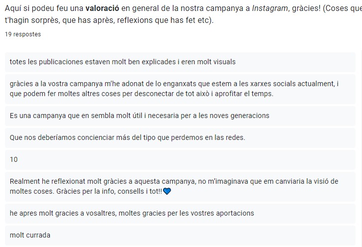 Per altra banda, quan es va aproximar la data de final de TdR i per conseqüència de la nostra campanya de conscienciació a les xarxes socials vam decidir fer un petit formulari per interactuar amb totes les persones que ens segueixen a Instagram i veure que han après; si consideren que hem estat una bona campanya; si pensen que amb alguns posts han reflexionat, etc.