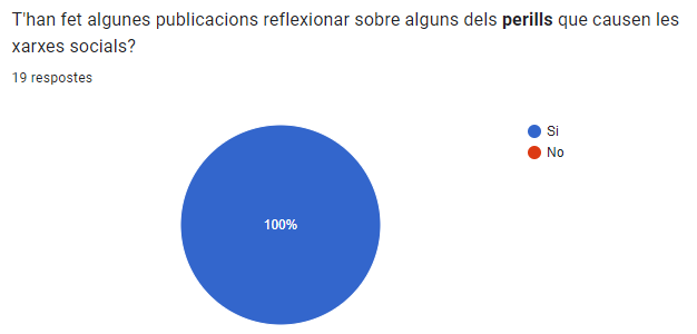 És molt bona senyal veure que les 19 persones que han fet el formulari han votat que si que han reflexionat dels perills de les xarxes socials, això indica que s’han adonat de perills que no existien i de tot allò que hi ha darrere dels perills.