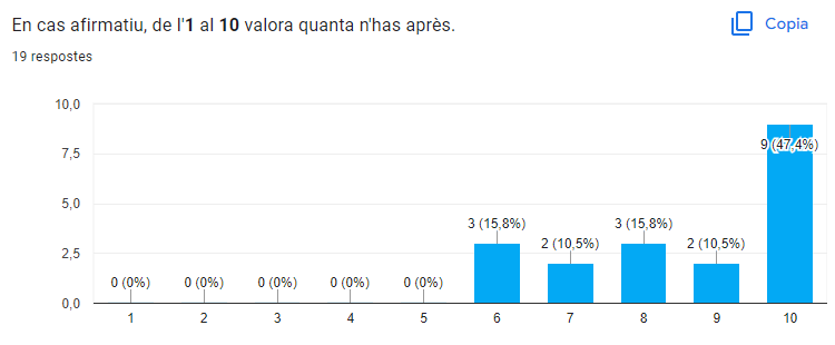 Com es pot veure hi ha gent que ha après més que altra. 9 persones han votat “10” (47,7%) i 3 persones han votat “6” (15,8%). Hi ha varietat de valoracions a partir del 6. Que el nombre més votat hagi sigut 10 és molt bona senyal.