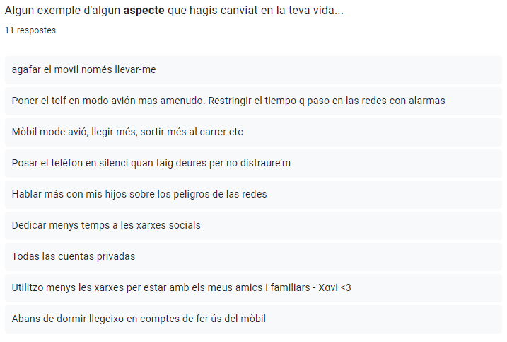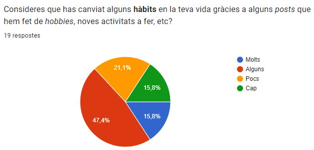 Volíem saber quins són alguns dels aspectes que han canviat en les seves vides per veure si realment hem ajudat amb la nostra informació. Com podem veure si que hem ajudat ja que totes les respostes estan relacionades amb els posts que hem fet i pujat.