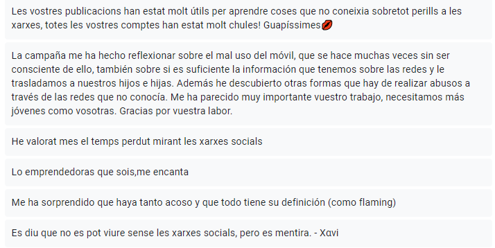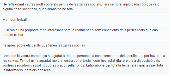 Aquests són tots els comentaris que hem rebut sobre reflexions i valoracions que hem rebut en aquest formulari. Com es pot observar la gent ens ha donat molt de suport i ens agrada veure que realment s’han conscienciat gràcies a Atrapats a la xarxa.