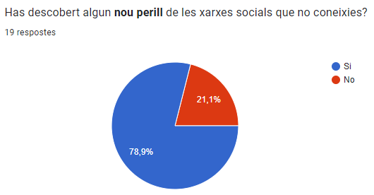 En aquesta pregunta 15 persones (78,9%) han votat que si han après algun nou perill i en canvi 4 (21,1%) no. Segurament al haver après un nou perill la gent ara el tindrà en compte a l’hora de fer ús de les xarxes socials.