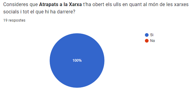 Gràcies a la nostra campanya de conscienciació i al formulari que vam fer, ens hem adonat que hi ha bastant gent que no té gaire idea sobre tots els perills que trobem a les xarxes socials i que, amb les nostres publicacions, han pogut aprendre i reflexionar sobre aquests i canviar alguns hàbits que no eren saludables. També amb els comentaris i missatge rebuts hem vist que en general no hi ha molta consciència de tot el que hi ha darrere les xarxes socials i considerem que amb Atrapats a la Xarxa hem obert més els ulls.