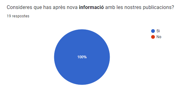 Tothom que va fer el formulari va votar que si que havien après nova informació gràcies a les nostres publicacions. Això significa que les nostres publicacions, històries i més han sigut una font d’informació de la qual la gent ha pogut aprendre coses que no sabia i ens alegrem d’això.