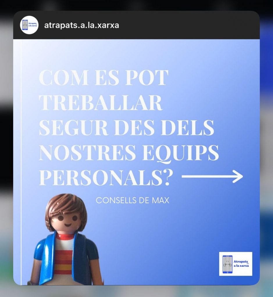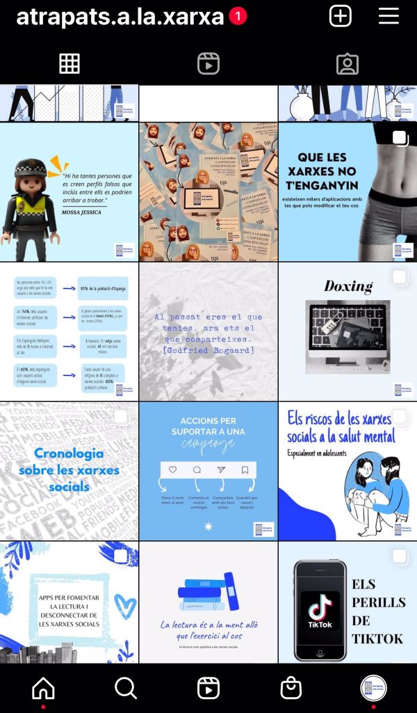 INSTAGRAM: és la xarxa social que hem emprat per publicar tota la informació possible sobre els perills que trobem a les xarxes socials. Per nosaltres aquesta és la plataforma més rellevant de la campanya, ja que és la que ens permet publicar més informació i de diferents formes. El nom de la nostra campanya a Instagram és: @atrapats.a.la.xarxa