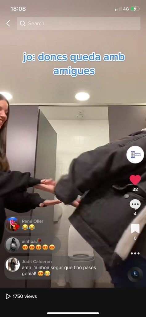 A més a més, TikTok es caracteritza per la quantitat de trends que fa la gent i les seves visualitzacions. Per tant, la nostra idea és anar fent els trends més virals, però donant informació sobre la nostra campanya i el que volem transmetre. Uns dels trends que més visites va tenir va ser el que us mostrem a continuació, el qual tracta de quan la gent s’avorreix sense els seus aparells electronics. Vam arribar a les 1900 reproduccions i se’l van guardar un parell de persones.