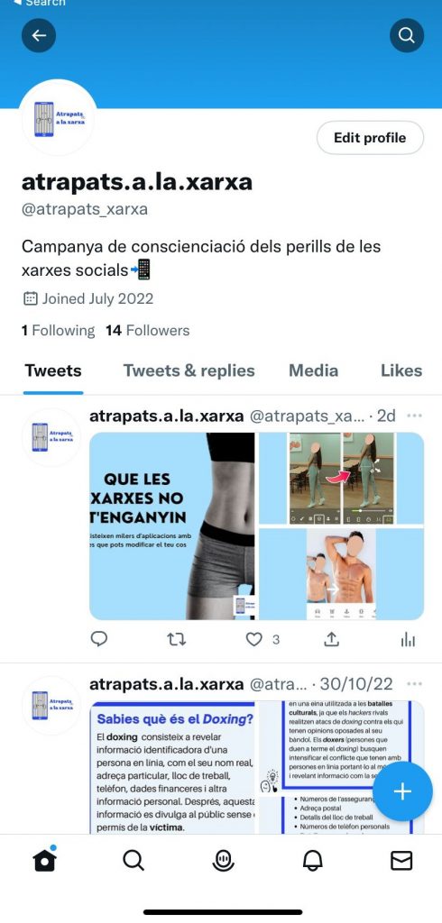 TWITTER: és una altra de les plataformes que hem utilitzat per fer la nostra campanya, per donar a conèixer els perills de les xarxes socials que hi ha avui dia. Encara que no és la plataforma que més s’utilitza actualment, pensem que mai ens ve de més donar informació per molt que ens llegeixin només 3 persones. El nom de la nostra campanya a Twitter és: @atrapats_xarxa