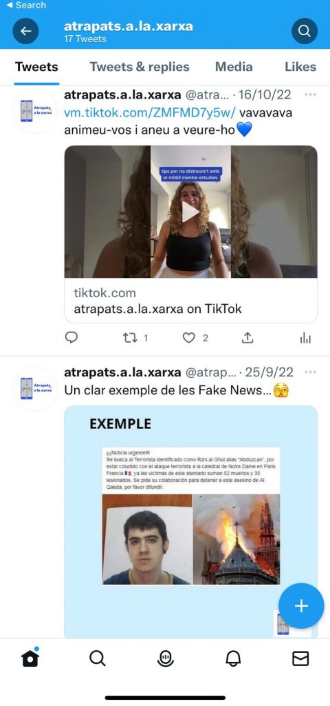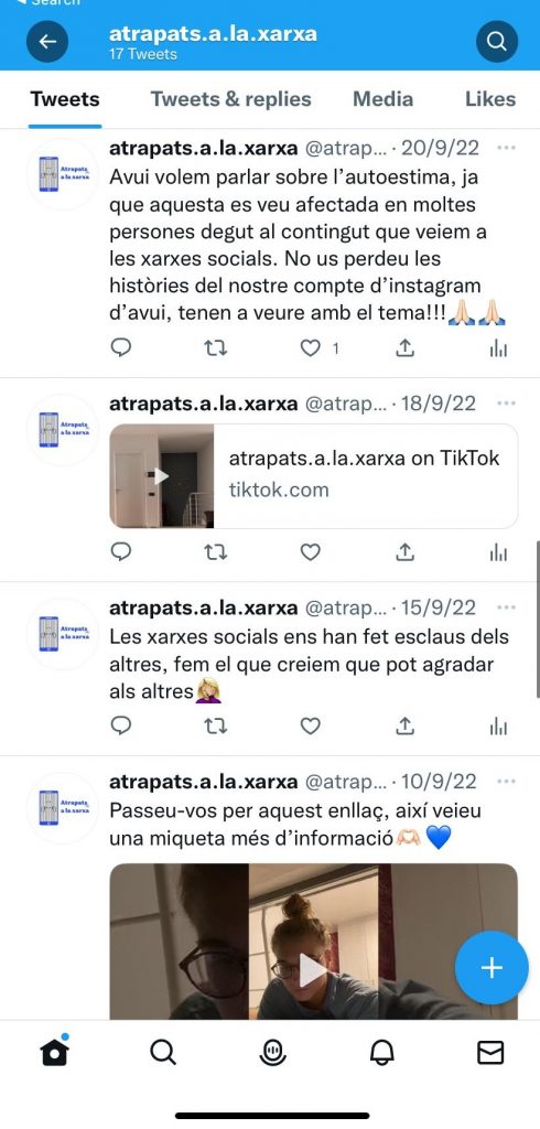 TIKTOK: Aquí pugem informació d’una manera diferent de com ho fem a Instagram i Twitter. L’objectiu és el mateix que a les altres plataformes, però ho fem en format vídeo i amb música de fons, perquè així sigui més entretingut. El nom de la nostra campanya a TikTok és: @atrapats.a.la.xarxa