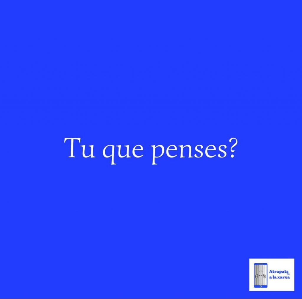 Aquest títol i logotip ens va agradar més a nosaltres i també a la tutora i per saber l’opinió d’altres persones una mica més externes vam enviar la imatge del logotip a gent diferent (coneguts, amics i família) per saber que era el que li venia al cap a aquesta gent en veure aquest logo. En general vam aconseguir les respostes que ens esperàvem (que no tenim vida fora de les xarxes socials, enganxats a les xarxes socials, persones atrapades a les xarxes socials, algú està atrapat per culpa d’alguna estafa online, o que en ser influencer ha d’estar tot el dia a les xarxes compartint la seva vida, etc). Aquestes són les respostes que més ens han arribat. Com veiem que la gent entenia bastant bé el missatge vam iniciar la nostra campanya en Instagram, Twitter i Tiktok i vam posar en cada xarxa social un post, tweet i vídeo de presentació.