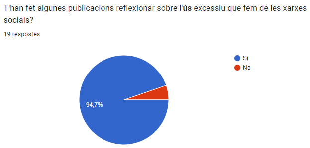Podem veure que a tothom menys a 1 persona (5,3%) han votat que algunes publicacions els han fet reflexionar sobre l’ús excessiu de les xarxes socials. Aquesta és una molt bona resposta.