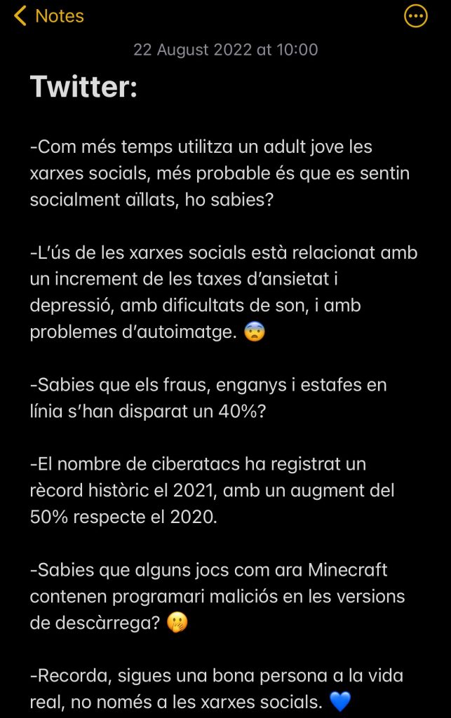 Vam fer això amb les publicacions a la resta de xarxes socials (Twitter i TikTok) per tenir tot més o menys controlat i organitzat. A Twitter vam fer un altre llistat amb les dades i frases que publicaríem, per exemple: