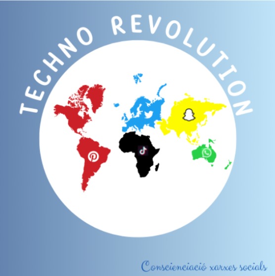 El primer pas va ser escollir el títol i el logotip de la campanya. Vam fer una pluja d’idees amb els possibles títols. Els dos primers títols que vam pensar van ser: Techno Revolution → Revolució Tecnològica / World Changing → Món Canviants. Ens va agradar més el de Techno Revolution, per tant, vam llençar-nos a la piscina i vam fer un logo amb l’aplicació de disseny canva. Aquest va ser el resultat.