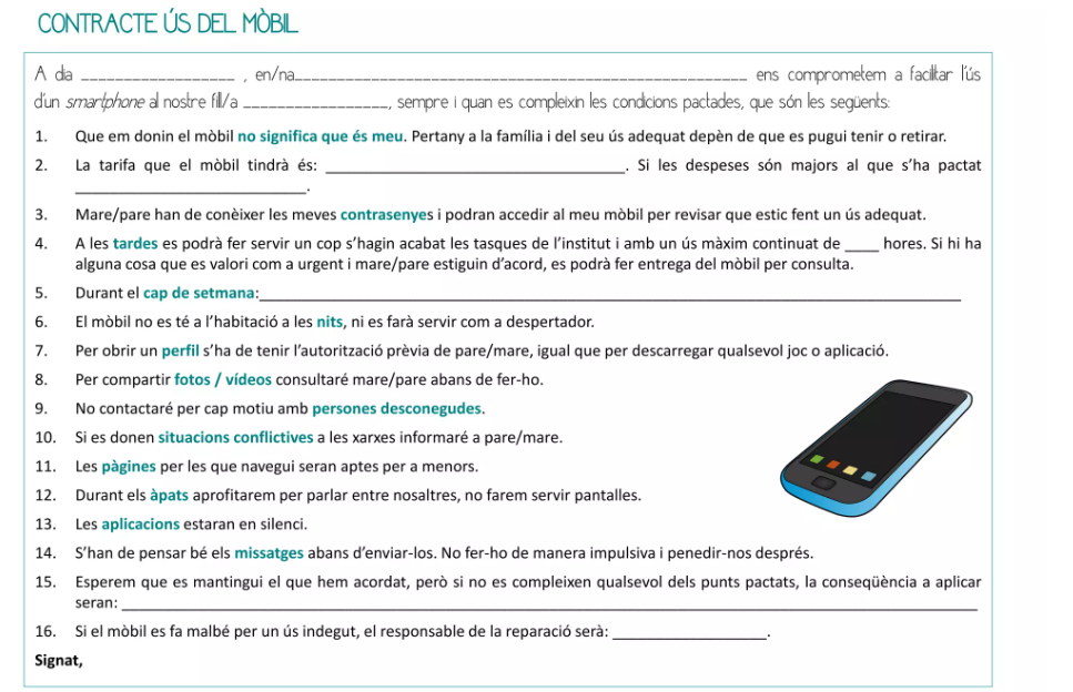 La mossa recomana fer un “Contracte de l’ús del mòbil” entre la família i els fills/es per establir acords sobre l’ús dels mòbils.