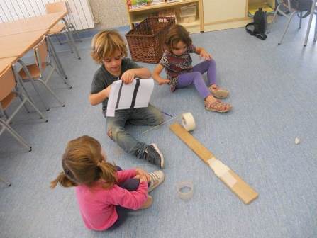 Fent conversa de com podíem saber quant creixien i com ho podíem mesurar (ja que la Núria, la Laia, el Ton i la Ivet quan feien p3 es recordaven de com vam mesurar el gall a la classe i que fèiem servir un metre) doncs deien de fer el mateix però de seguida van veure que no podíem portar les cols a la classe perquè es moririen, per tan vam decidir de fer uns mesuradors. Els hi vam portar diferents materials i en van construir de molt interessants.