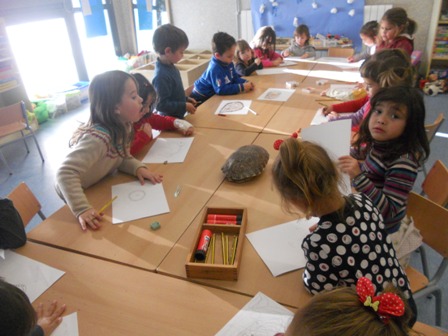 L’Ahmed nur ens ha portat a la classe una closca de tortuga gran, era d’aigua, hem pogut veure la closca i la columna vertebral que la tenia enganxada a la closca. Hem vist quines formes té la closca i l’hem dibuixat.