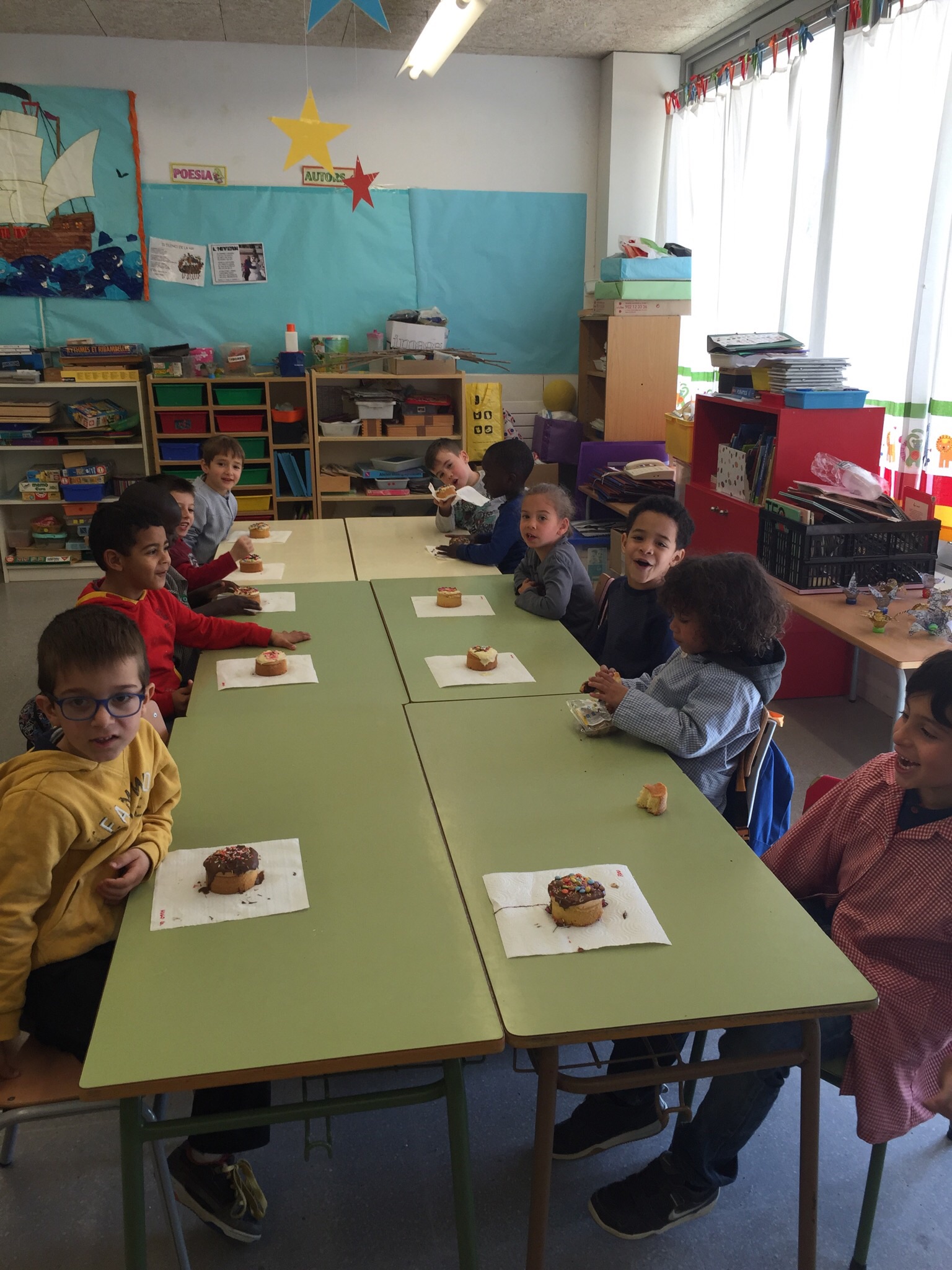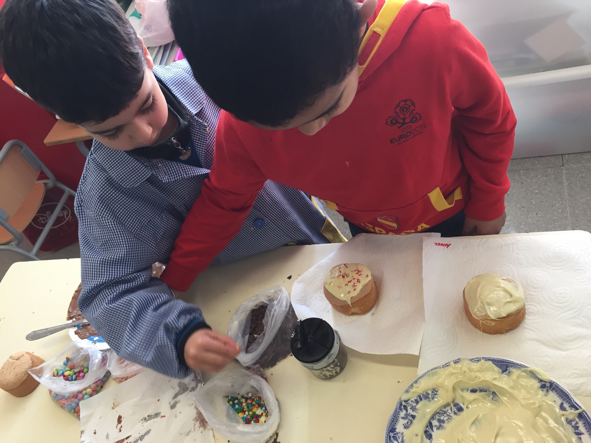 La mona ens ha quedat boníssima: pa de pessic, diferents tipus de xocolata, decoracions de colors, pollets … Mmmmm….
