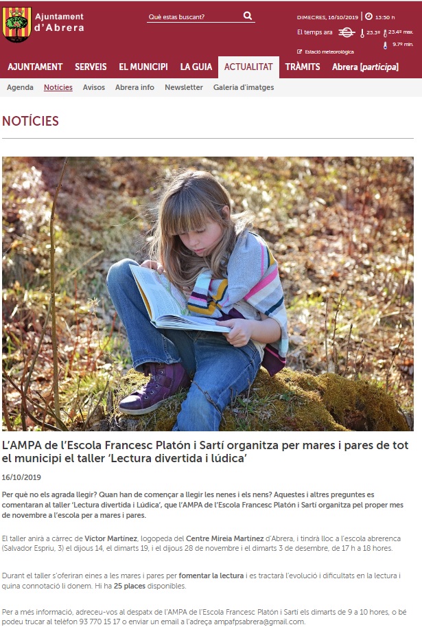 L’AMPA de la nostra escola organitza un taller per a totes les mares i pares del municipi. L’Ajuntament ha fet resó de la notícia.