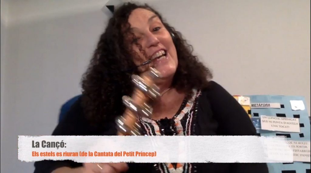 Altra cop sona la música i tots acompanyem el Petit Príncep que va volant d’una punta a l’altre de la sala, fins que para la música i es troba un altre planeta (canvia el color), on hi ha un senyor amb una ampolla a la mà.