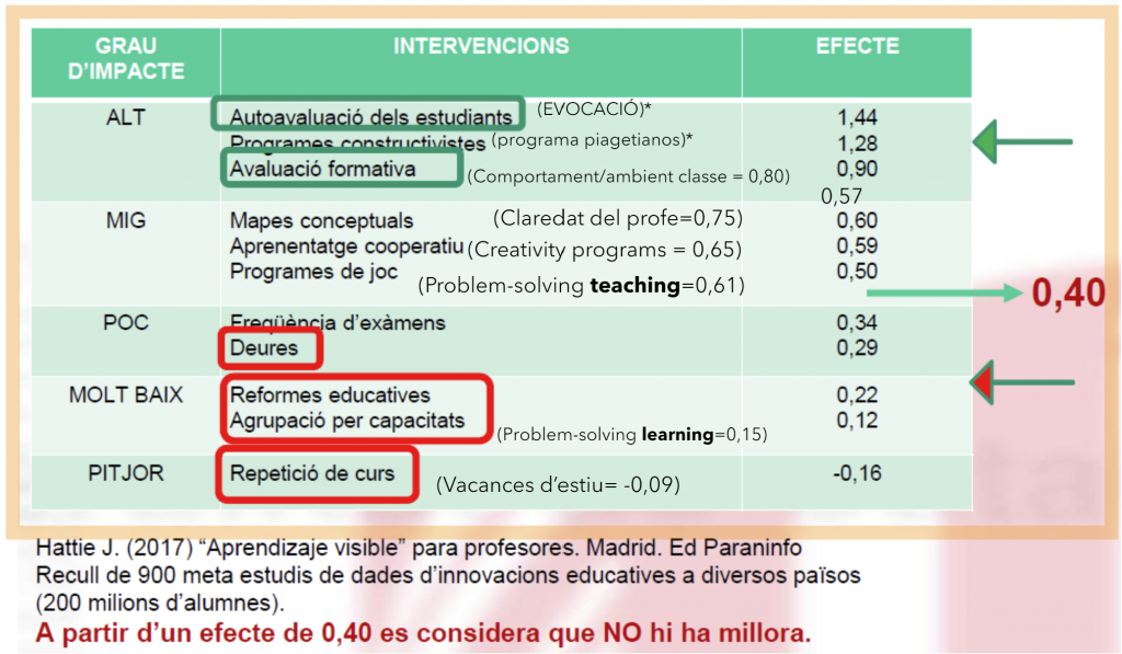 - Grau d’impacte de tecnologies digitals sobre l’avaluació. Inferior al coeficient de 0,4 no té un impacte significatiu en la millora de l’aprenentatge de l’alumnat