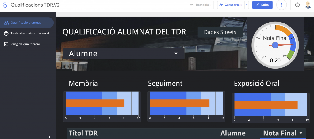 La ponderació dels ítems que apareixen en el full es va fer de manera col·legiada i va implicar a tot el Claustre. Per veure el funcionament cliqueu sobre l’enllaç lookerstudio . La base de dades feta amb Google Sheets apareix en el botó “Dades Sheetts” que es pot veure a la imatge. Els noms de docents, alumnat i qualificacions és fictici.