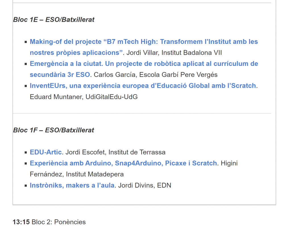 - X Jornada Programació i Robòtica Educativa (any 2018). Vaig fer una ponència sobre una anàlisi de la robòtica educativa segons la meva experiència Snap4Arduino, ArduinoBlocks o IDE Arduino?. A més a més, durant la mateixa jornada vaig participar com a tallerista i vaig crear unes activitats per iniciar al professorat a la programació i la robòtica. El material que vaig deixar a disposició dels docents s’adaptava als necessitats de l’alumnat perquè per aconseguir el mateix repte es resol amb programació per blocs o programació amb codi: Activitats del taller Snap4Arduino i IDE Arduino.