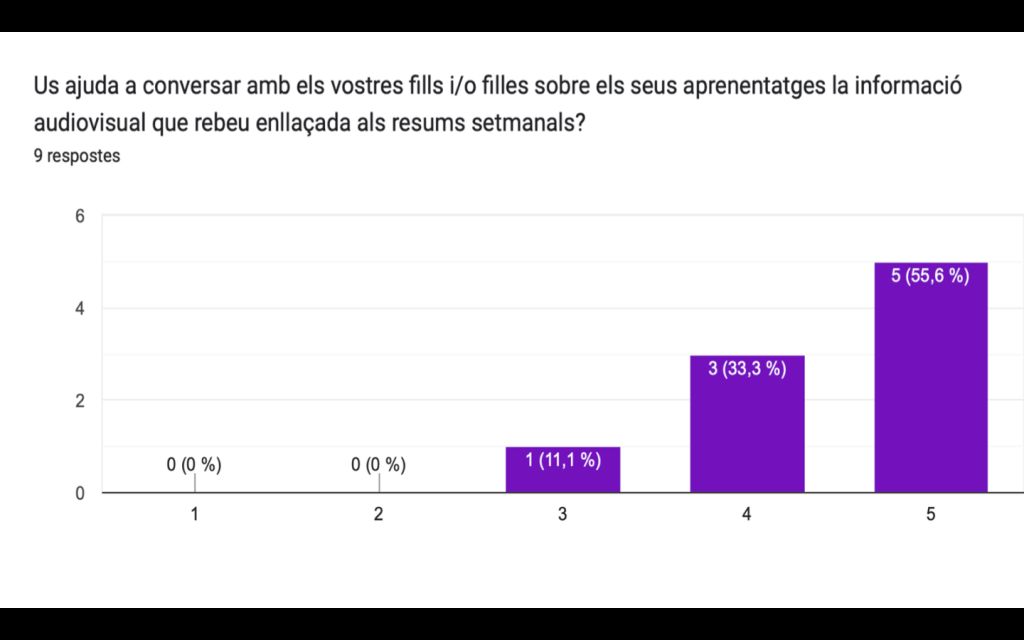 - Gràfics de les respostes del Google Forms per part de les famílies per valorar el grau de satisfacció de les eines digitals que emprem per transmetre la informació dels aprenentatges dels infants a l’aula (no han participat totes):