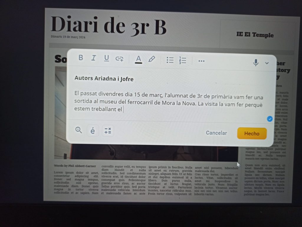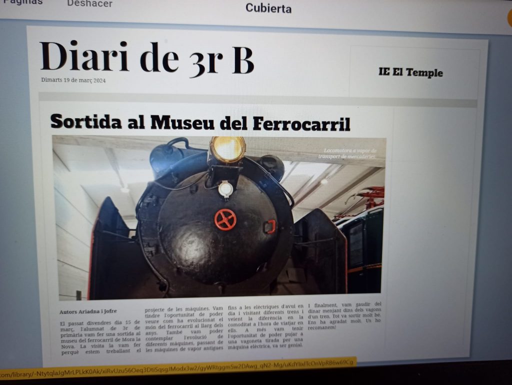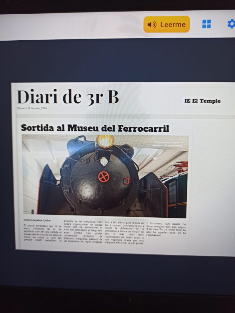 Imatges de l’alumnat creant un article per enviar a les famílies sobre la sortida realitzada al Museu del Ferrocarril de Mora la Nova.