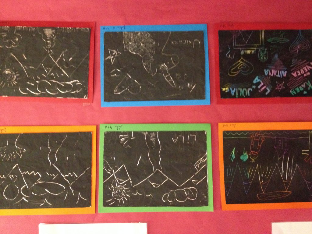 Un altre és l’esgrafiat que consisteix en pintar tot el full de colorins , després ho pintem tot amb cera negra i, amb un escuradents fem dibuixos.