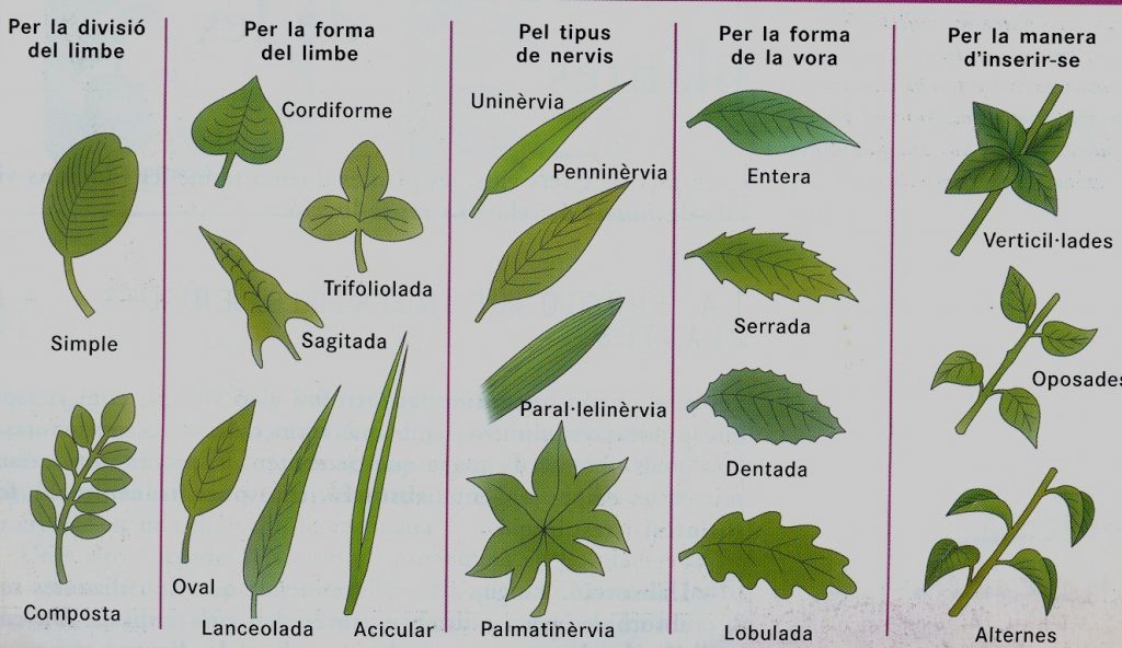 Quan vam acabar d’estudiar les plantes vam classificar les fulles per grups com per exemple: Per la forma del limbe, per la manera d´inserir-se, pel tipus de nervis, per la forma de la vora i per la divisió del limbe.