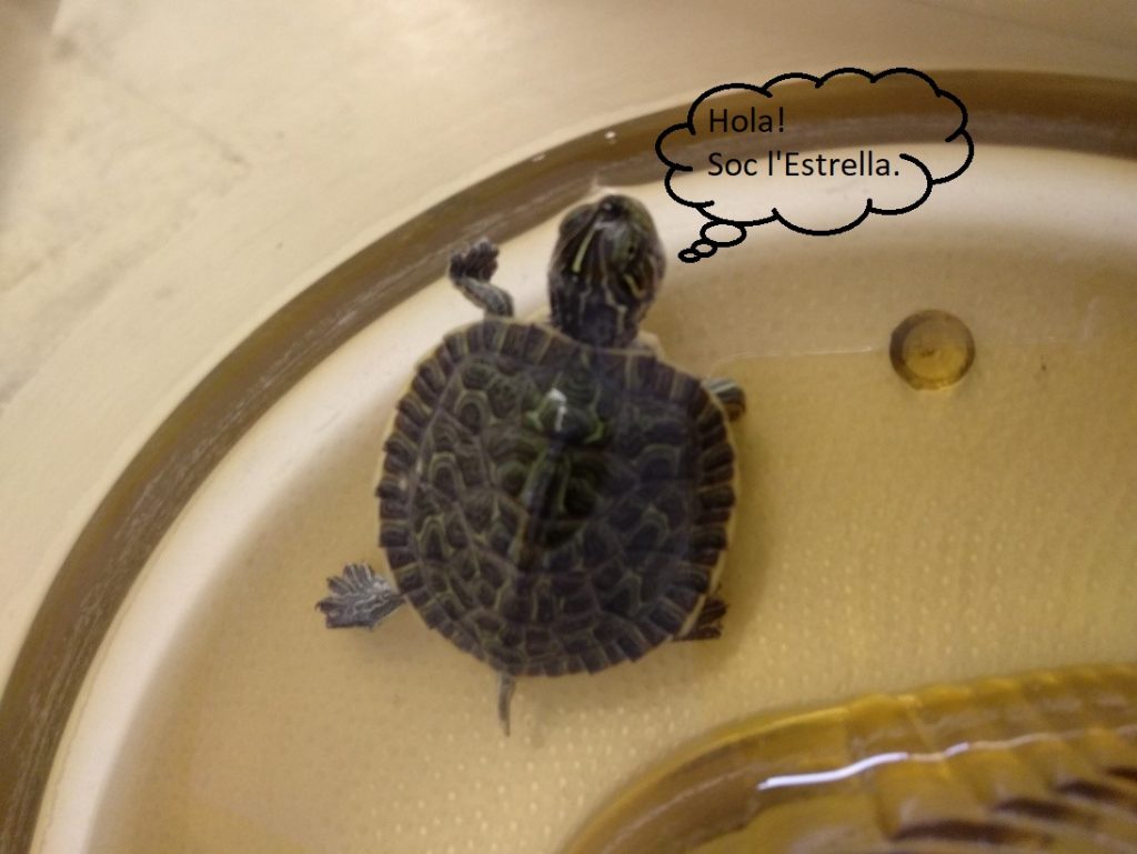 Durant tots aquests dies que l’Estrella ha estat a la nostra classe, l’hem anat observant. La veiem contenta, bé, que està en un lloc molt petitó, que li agrada estar a prop de la palmera, que és tranquil·la, que camina i neda ràpid, que potser troba a faltar al Zak …
