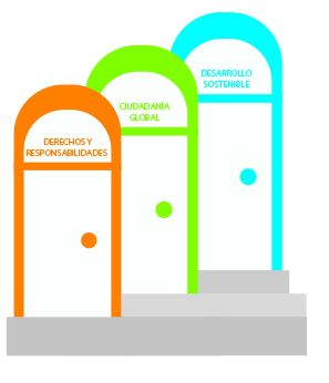 Para entender mejor cómo se relacionan los diversos enfoques de la educación para el desarrollo podemos usar la metáfora de los umbrales: Los derechos de la infancia son la puerta de acceso al ejercicio de la ciudadanía global, solidaria y responsable. A su vez, este conocimiento es el umbral de acceso que permite a la infancia el compromiso de manera crítica y responsable con el desarrollo sostenible. Conocer el valor de nuestros derechos y responsabilidades y aprender a ejercerlos es un requisito para la ciudadanía, sin la cual no es posible participar de manera activa en el logro de un desarrollo sostenible.