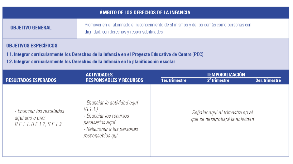 1.1. Integrar curricularmente los Derechos de la Infancia en el Proyecto Educativo de Centro (PEC) 1.2. Integrar curricularmente los Derechos de la Infancia en la planificación escolar 1.3. Integrar curricularmente los Derechos de la Infancia en la Programación General Anual (PGA) del centro. |