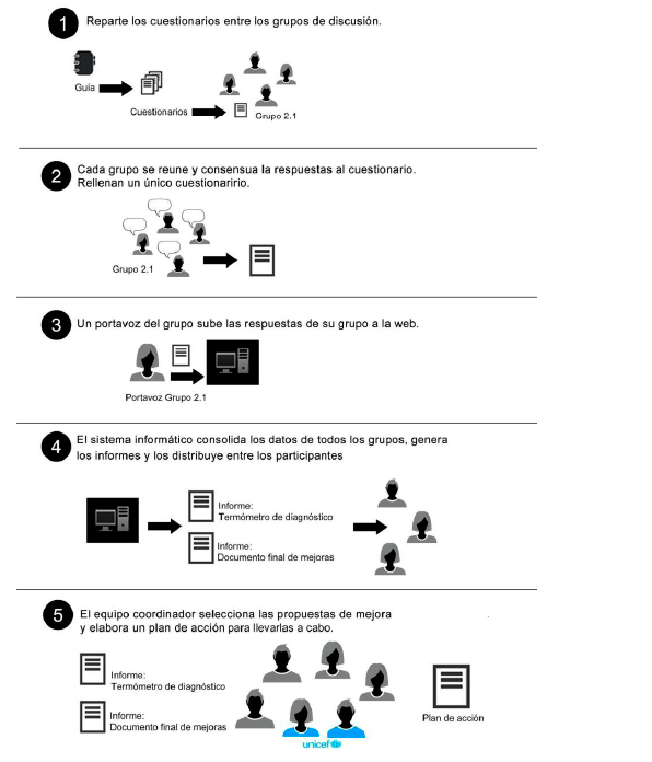 Cada uno de estos grupos realiza la autoevaluación y diagnóstico inicial de una forma autónoma, en una reunión de trabajo en la que responden a las preguntas de su respectivo cuestionario y realizan propuestas de mejora en los ámbitos que consideran más importantes.