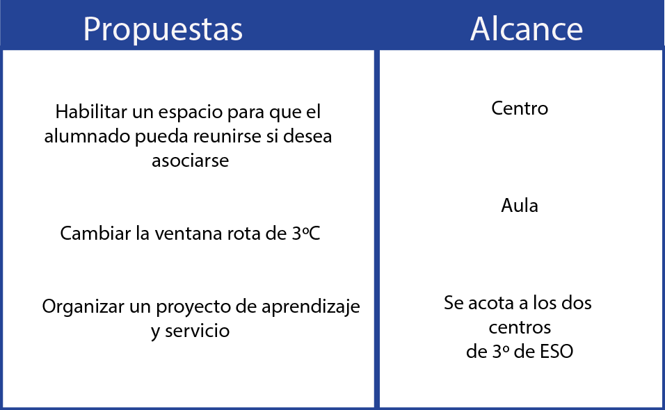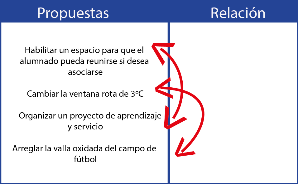 - Nos permite agrupar aquellas propuestas que estén conectadas y que mantengan una relación funcional o persigan similar propósito. En el ejemplo, la primera y tercera propuestas pueden agruparse, porque se refieren a actividades de participación que pueden estar relacionadas. La segunda y la cuarta también pueden agruparse, por ser actividades de mantenimiento relacionadas con la seguridad del alumnado: