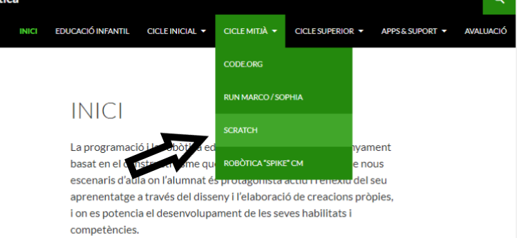 Per accedir al lloc web d’Scratch seguiu les instruccions que teniu al vostre Cicle: desplegueu el menú de “Cicle Mitjà” o “Cicle Superior” i cliqueu a ‘SCRATCH”.