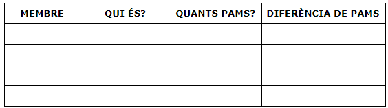1. PRESENTA A LES PERSONES AMB QUI VIUS I MEDEIX AMB PAMS QUANT MESUREN. DESPRÉS CALCULA LA DIFERÈNCIA DE PAMS ENTRE TU I L’ALTRA PERSONA.