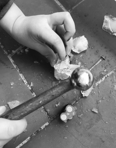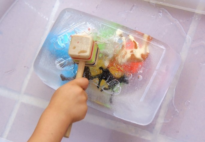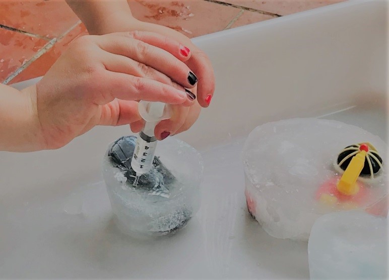 - Utilitzar totes les tècniques possibles per rescatar les joguines (Pots utilitzar la llengua, recursos com deixar un dels blocs de gel al sol, tirar xeringues amb aigua calenta, polvoritzar el gel i mirar els resultats, picar els blocs amb martell…)