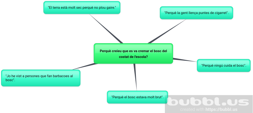 Els alumnes de primer van començar a fer-se preguntes sobre per què tancàvem les finestres de la classe perquè hi havia fum a causa de la crema del bosc del cost de l’escola. En aquest context, vam decidir començar el tema del canvi climàtic a partir d’una situació real que va succeir en el seu entorn. La nostra classe disposa de pissarra digital i vam aprofitar aquest recurs per tal de començar aquesta activitat d’exploració utilitzant l’eina bubbl.us. A continuació podeu veure el mapa que vam crear entre tots: